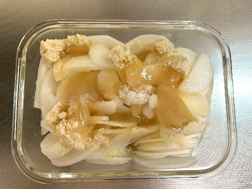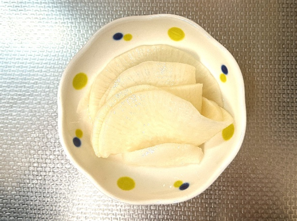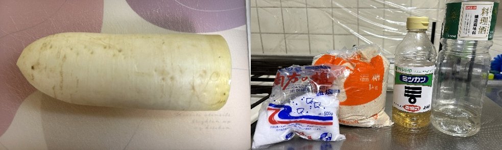 大根:半分、酢:大さじ2、塩:大さじ1、酒:大さじ1/2、三温糖:大さじ8